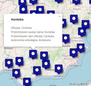 Frantziako Errepublikako eskualde, departamendu eta hiriburuen izenak eta Espainiako erresumako autonomia-erkidegoen, probintzien eta probintzia-hiriburuen izenak mapa digital banatan antolatu ditu UZEIk. Horretarako, hurrenez hurren, Euskaltzaindiaren 36. eta 32. arauetako informazioa txertatu du mapa horietan.