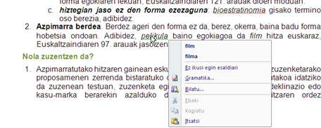 Eta, jakina, aztertutako testuetan ezagutzen ez dituen hitzak gorriz zerrendatzen dituenez (adib.denpora idatzita, denbora eta tenpora proposatzen ditu), akats ortografikoak detektatzeko ere lagungarria izan daiteke.