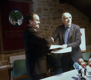 Hiru urteko iraupena izango duen hitzarmena sinatuz, bi erakundeen arteko lankidetza-konpromisoa berritu dute gaur Berria Taldeko kontseilari ordezkari Iban Arregik eta UZEIko zuzendari Imanol Urbietak.